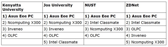 As for the OLPC, it was consistently ranked best for power consumption. However, it was the slowest of all tested systems, and the operating system didn't include software for spreadsheet or video playing. Only one of the universities (Jos) was able to install an external video player on the OLPC. This made it the least popular of all tested solutions.