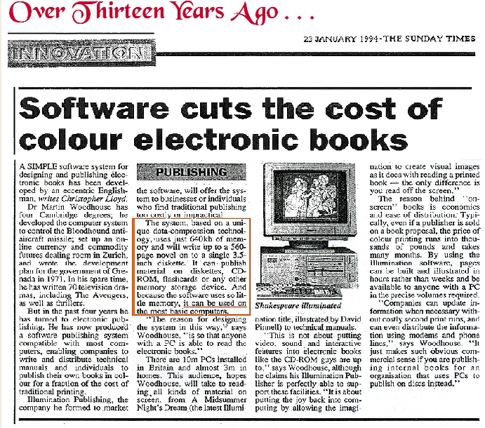 In technical terms, while I'm interested in the compression schemes you have employed in Illumination, I suspect that similar (or better) results can actually achieved by more current technologies (e.g. DjVu, SVGs - or just well crafted pdfs). It is also important that we recognize the rapid decrease in transmission costs. I regularly download video content faster than real time viewing via P2P. The same technology would allow most pdf ebooks to download in minutes. Otherwise, a download could just be left running over night...
