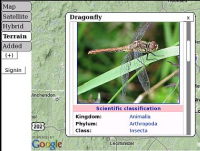 Each marker can have an embedded photo, Google search, or Wikipedia article. The code wiki::Dragonfly embeds a Wikipedia article in Simple English, and wikiFR::Anisoptera embeds the article in French.