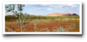 Some hours later - we glimpsed tall black plumes to the north, and dusty wirly wirly's to the south. Hot, red, and flat, except for anthills wearing miners hats, and small oblong hills. Through the semi-arid savannah we listened to the 'Brand Nue Dae' soundtrack on the stereo, having picked up food supplies including salads, nine loaves of bread and 110 sausages for a community BBQ. We counted how many trailers the truck are pulling (some three, some four), and the animal carcasses. A low line of hills emerged in the distance, but we turned off before them. The hills have yellow-green bush growing on them that contrasts with the red, almost purple soil, the intense colour creating an azure blue line between the ridges and sky.