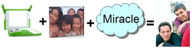 It's not by training teachers. It's not about building schools. With all due respect [to HP's e-inclusion efforts], it's not about curriculum or content. It's about leveraging the children themselves.So in other words, Nicholas Negroponte doesn't believe in the tried, tested, and confirmed power of teachers, working in structured classroom environments, to exceed his "magic", his OLPC implementation miracle, which looks something like this:Does Negroponte's seemingly Utopian attitude concern you? Do his dismissive comments about traditional pedagogical models make you wonder about OLPC's probability of success? And are you scared that because of a lack of focus on content and curriculum, all the efforts, hopes, and Billions of dollars this project is consuming might become a giant boondoggle?
