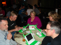 In February of 2008 I was presenting at NCCE in Seattle and brought along my XO's, as folks were pretty interested in them. I ended up at a bar one evening during the conference with my three XO's, meeting up with edtech blogger Wes Fryer and his wife, and principal Glenn Malone and his wife.