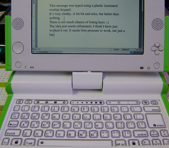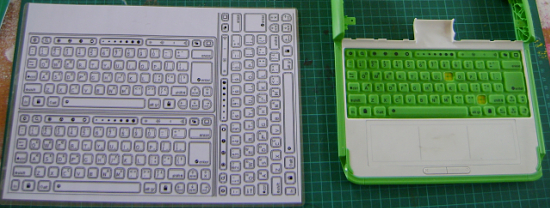 I noted that the keyboard membrane appears to be the XO's Achilles' heel. It is very tempting for little fingers to pick at the keys and remove them. Seeing the pictures of the XOs that have been loved to a state where their keyboard membranes are falling apart prompted me to try an alternative.