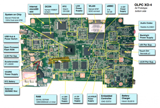 Annotated photo of bottom side of XO-4 A2 version motherboard