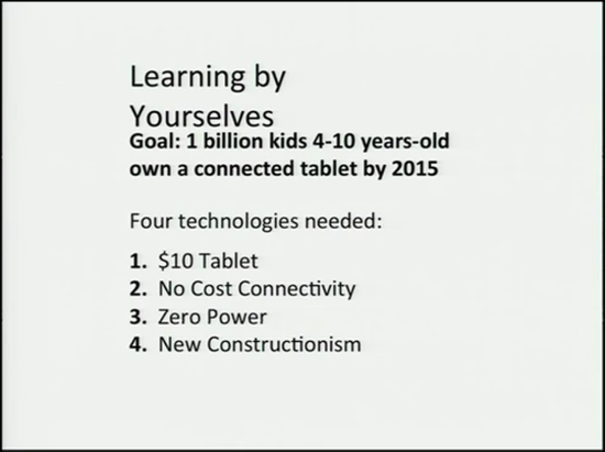 At the recent Solve for X forum Nicholas Negroponte gave a 15min presentation with the title Learning by Yourselves. Since a number of other olpc aficionados had recommended watching it on Facebook, Google+, and Twitter I also decided to go for it. And I certainly didn't regret it as Negroponte spent surprisingly little time talking about OLPC itself and instead focused on more of a mid-term perspective.