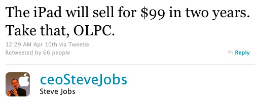 Congratulations to Apple for selling 300,000 iPads on the first weekend. I'm sure the product will be come a great success for the company. But while die-hard Apple fanboys were celebrating, this tweet from a spoof Steve Jobs caught my eye: