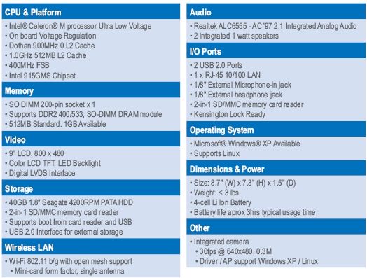 This is a laptop for education. It has a low voltage processor, mesh networking, LED backlight screen, and even an integrated camera. It can also run Windows XP in addition to Linux.