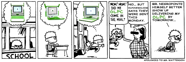 Tagged Bill Waterson, Calvin and Hobbes, James Chung, OLPC News, OLPC News Cartoon, OLPC Wait, XO Laptop Lust