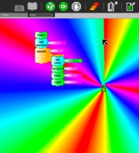 Out of control. Still driven in large part by requests coming in from teachers, I added named variables and subroutines (with help from Luis Michelena), a program stack, rich media objects, et al. And I made changes to the UI, notably adding toolbars to keep it more in line with the current look and feel of Sugar. And of course, I felt obliged to add collaboration - a sharable canvas.