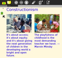 They create multimedia narratives from their selections (including audio voice-overs and video) and they can share their presentation with classmates, both to celebrate what they have learned, but also to engage in a critical dialog about their work. I added a means to export to HTML so that the presentations can be shared outside of the context of Sugar. On my next long flight, I'll add export to ODP too.