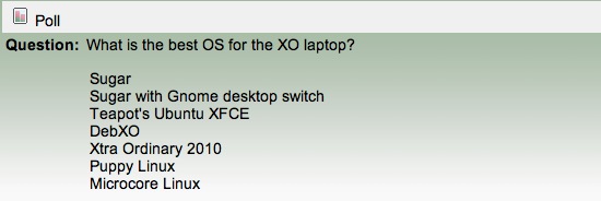 Thanks to much hacking by the OLPC community, the XO laptop now supports several operating systems: Sugar, Sugar with Gnome desktop switch, Teapot's Ubuntu XFCE, DebXO, Xtra Ordinary 2010, Puppy Linux, Microcore Linux. But which one is the best? Recently, we had a OLPC News Forum Poll: Best OS for the XO? to figure that out.