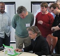 We will begin with a photo of Microsoft demoing Windows XP on the XO to OLPC. There I see happiness and awe. Geeks all excited about a new technology trick - fitting the fat Windows XP on the slim OLPC XO. Developers in praise of each other's work, a mutual respect of brilliance brought to bear.
