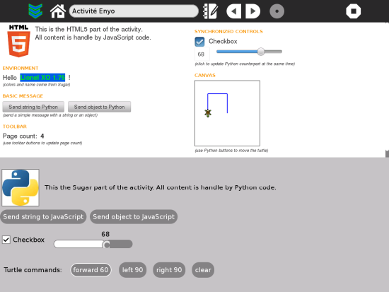 This other Activity use basic and complex message exchanges between Python and JavaScript and use events to synchronize Python widgets with HTML controls. More, it include a small HTML5 Logo Turtle that you could pilot from Python :-)