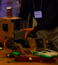 Hanging out on IRC or email lists is never going to result in the kind of concentrated knowledge transfer that happens at a real-world meeting. The cool photo on the left is a hacked up XO projector that was shown off at the sugarcamp.
