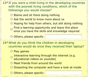 Simonfish is a F.5 student from St. Paul's College in Hong Kong. He is working on a project about One Laptop Per Child and has devised a short survey to acquire first-hand data from the general public for his IES.