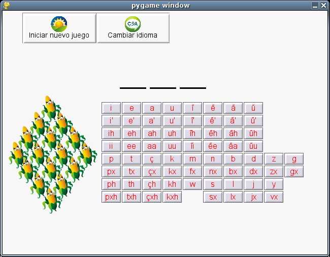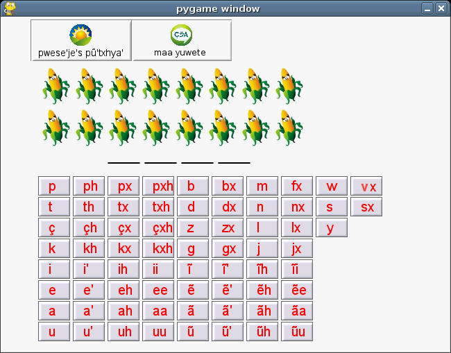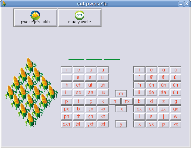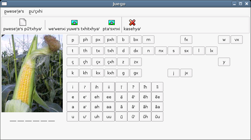 To test some guidelines for developing suitable software for the Nasa people, we decided to develop a Nasa Yuwe Word-guessing game, a kind of "hangman", not with man that finally dead hanged up, but with a maize plant that lost all its lefts and grains if the user fails to find the word. It was called çut pwese'je (the maize game).