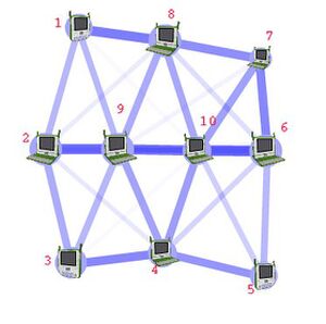 In this example concurrent iperf sessions between nodes 1 and 4, 3 and 8, 2 and 10 will stress node 9. It is also important to use this topology to measure broadcast/multicast frame loss rates by means of having every node transmit a set of multicast frames at various rates while their reception is recorded on every other node.