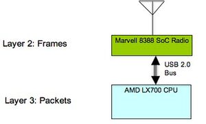 This architecture allows for power savings (since only the Marvell SoC radio is necessary for frame forwarding) and flexibility with upper layer protocols (since it is not depending on any specific Layer-3 protocol - automatically supporting IPv6 for example). It also presents testing challenges in the laptop context since there is no direct user interaction with the ARM processor of the radio.
