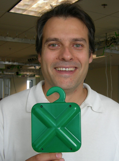 The picture shows Michail Bletsas, OLPC's chief connectivity officer, holding a pre-build Active Antenna.