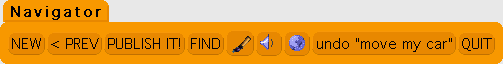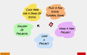 - violet "new project": start creating your own projects. Journal integration is still missing, but you can save your work to the MyEtoys folder by pressing "PUBLISH" in the orange navbar. There is extensive documentation on Etoys in the wiki (start here) and at squeakland.org.