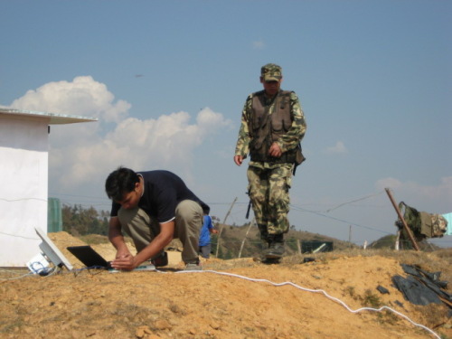 We were back to the school to complete this end of the networking. Which required us to fix a relay from DOE at the Army outpost and get it connected to the school and also setup an omni antenna as an AP for the XOs. After half an hour of diplomatic talks with the Army officer in-charge of the barrack, we were finally allowed to setup it up. Since we could not use power from the barrack. We decided to run a cat5 cable across to the school about 100 mtrs away to power up the radio over POE from the switch at the school. For certain reasons the 16di radio refused to power up, and we had to use the 19dbi radio instead as the relay which gave connectivity at 72 dbm rssi 0% packet loss. That was the highlight of the day, as the omni radio too refused to power up, so we didn't get to install it.