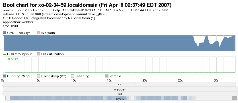 This shows that the start up is processor lmited. It would be useful to analyze this with OProfile or the python profiler to see where the processor is spending its time.