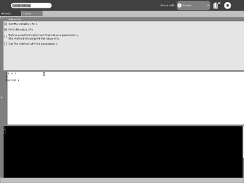 Assignments will be presented as a set of individual steps that the user must complete. Assignment completion will be based on a flexible system of code analysis. This system is currently implemented using python's abstract syntax tree functionality.