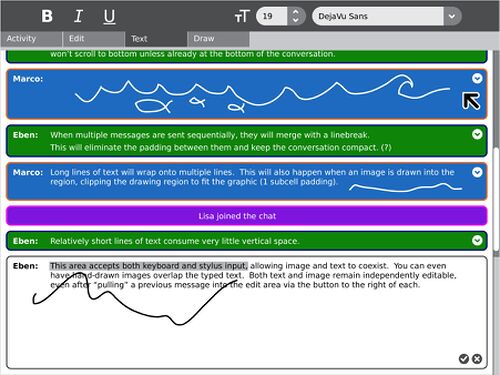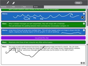 In addition to supporting both text and drawing, the Chat activity will encourage conversation and iterative process by providing a "pull" button for each entry. When a child clicks this button the content of the chat bubble - both image and text - get pulled into the input region, allowing her to alter or append both text and image. When the modified drawing or text becomes part of the conversation, it enters the stream as a new bubble, preserving the previous comments and drawing iterations.