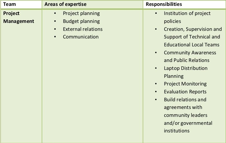 For successful implementation of the OLPC project, we highly recommended deployments to recruit and build a local team with skills in: managerial, logistics, technical, and educational fields. The term we use to refer to this team is the “Core Team”. This team will serve as the interface between the project and OLPC.
