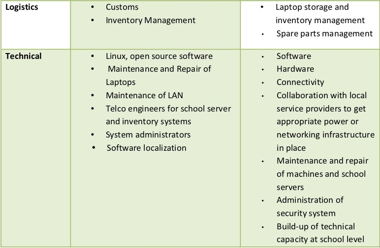 For large deployments (>50,000 units) we consider a vital requirement to comply with all members mentioned in the organizational chart. Local leaders should be hired as educational/learning and technical managers to coordinate matters related to their area of expertise. A logistics coordinator should be in charge of laptop storage, inventory and spare parts management. For smaller deployments (<2,500 units) the logistics manager’s tasks can be performed by the technical and/or the project manager.