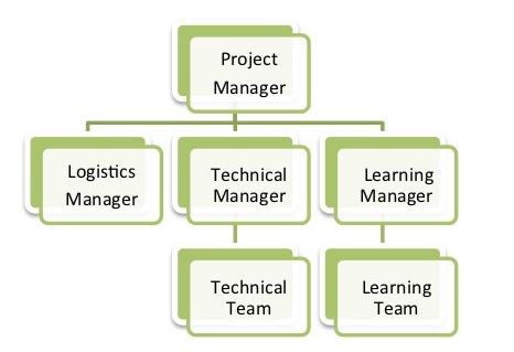 We advise hiring a project manager with experience in: project and budget planning, external relations and communication. This manager is expected to plan and coordinate operations, as well as to supervise the different departments involved in the project. In addition to managerial skills it is preferable that the potential manager has a background in technical and/or educational fields. The project manager should take on the selection of the core team members he will manage. The following organizational chart for the Core Team is recommended: