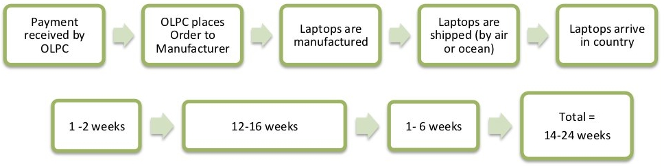 Upon receipt of payment (cash in advance or letter of credit), OLPC sends a purchase order to manufacturer; this takes 1-2 weeks to process. It normally takes 12-16 weeks to manufacture the laptops. The manufacturing company has the capacity to produce 240,000 laptops per month for OLPC although pre-existing OLPC orders would normally reduce this capacity. (Few projects are capable of dealing with more than 50,000 laptops arriving in a single month.) OLPC normally quotes 6 weeks for sea shipment of the units. Shipping the laptops by air takes less time from pick up to delivery destination. However, airfreight is more costly and is not recommended.