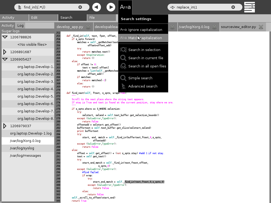Good find/replace support, check out the UI (though there is still room for improvement - search history, shift-fkeys to hard-open the palettes...). F5-F8 (the circle-slider on the XO) are set to: find, find prev, find next, and {set replace or, if replace was set since find, do replace}, respectively.