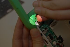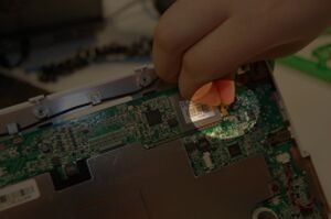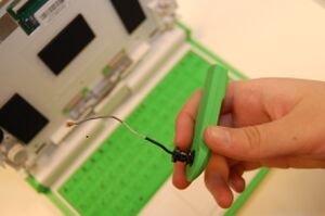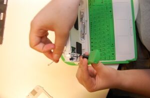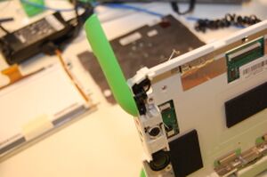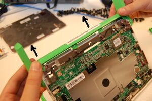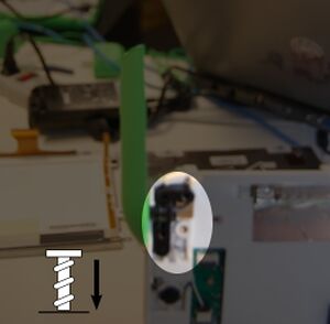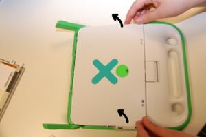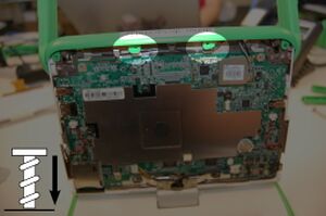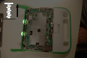 This is a description of how to finish disassembling the top section (first part) of an B4 preproduction XO laptop to replace the wireless antenna (rabbit ears). This is part of the Disassembly section of the Troubleshooting Guide and Repair Manual.