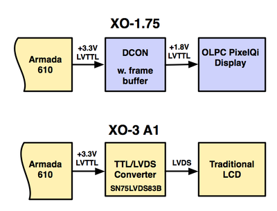 The XO-3 A1 prototype used a different approach, due to time and money constraints. Instead of a DCON chip, it uses a conventional LVTTL/LVDS converter chip (the TI SN75LVDS83B) and a recent technology (2011) display. This display uses an LVDS interface, and integrates the LVDS receiver and TCON into the source driver mounted on the glass.