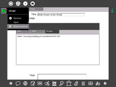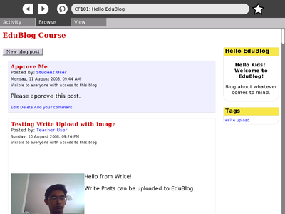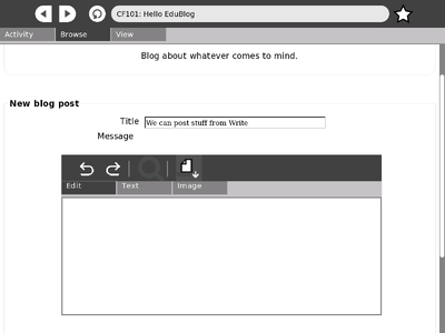 The following use cases demonstrate EduBlog's basic features. All images are actual screenshots taking on an XO-1 with Build 656 running BrowseNew and WriteNew. It is assumed that the admin or teacher has already entered the settings for EduBlog to connect to the remote blogs. Moodle EduBlog, commit from August 6, 2008, was locally run on Ubuntu with LAMPP and AbiWord 2.6.0 since the main server was down. Some screenshots were edited to make this guide easier to follow.