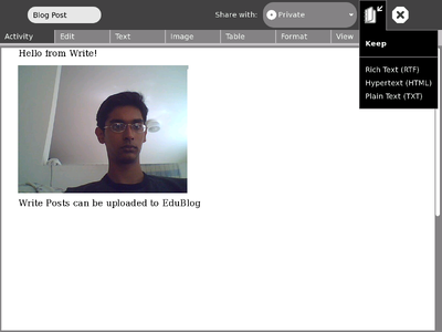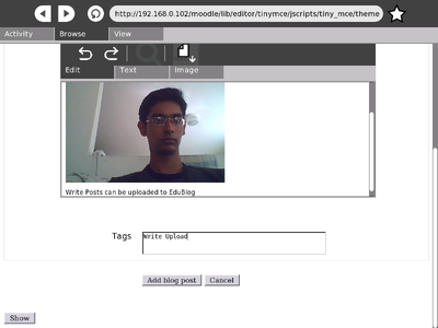 Those using build 656 (not 656 update 1) will need to install a patched version of Browse and Write in order to insert images or upload from Write. These patched versions are BrowseNew and WriteNew and will install along side the existing Browse and Write activities on the XO. The icons are black and have a star on top of the standard sugar icon. Do not try these patches unless you are absolutely sure you are using build 656 prior to update 1. It is also recommended that those using build 656 eventually upgrade their builds and use the newer versions of the activities which have been fixed.