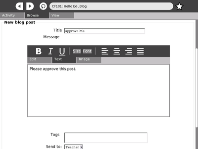 Create a Blog Entry and Click Add to Blog. Notice the "Send To:" option says "Teacher"