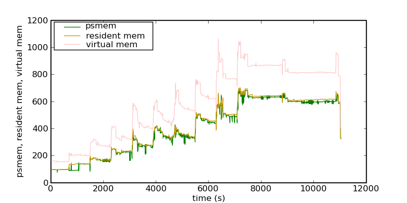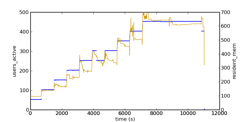 Here you can see the memory use is slightly over 1 MB per user, and growth is approximately linear or slightly in excess thereof. The server has 1GB of ram.