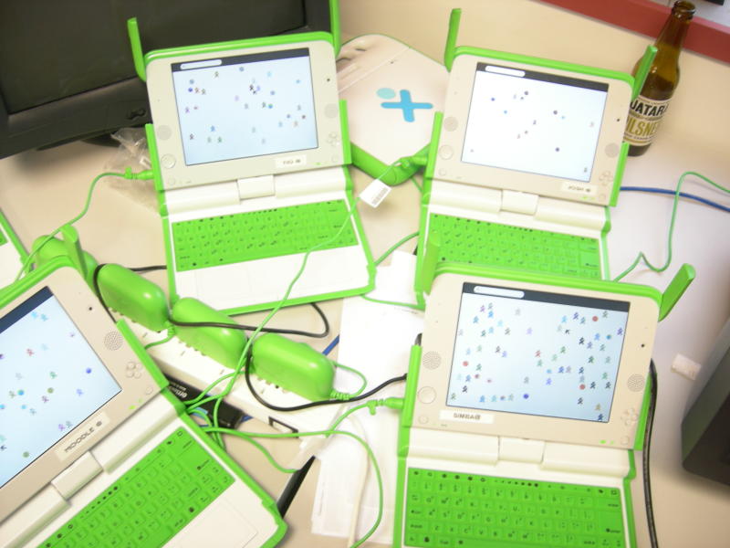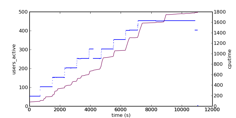 For this test several hyperactivity instances were used, each running 50 clients. 4 XO laptops were also connected, so the total number of clients was at most stages 50n + 4.