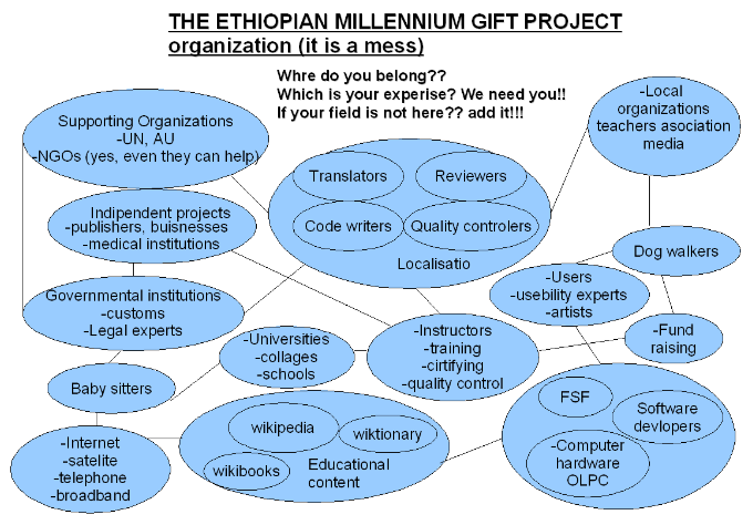 You do not have to be a programmer to make a difference. What you can, we need that. We need project coordinators, lawyers ,translators, testers, bug reporters, documentation writers, tutorial writers, artists, advocates, babysitters... . We need your experience and guidance. We need and highly value your input. And if you are also a programmer, well that's good, but it isn't essential. Put your name and your love on the greatest gift of the millennium to the Ethiopian people. Organize working groups in your areas, and help.
