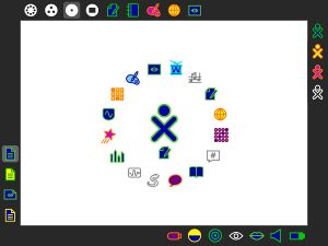 In the new Frame, the edges represent: places, people, devices, and objects. The Frame is accessed by putting the cursor in the corner or on the edge of the screen (see Frame control panel for setting these options) or by pressing the Frame key in the upper right of the keyboard. If the Frame is started by key stroke it must be removed by keystroke.