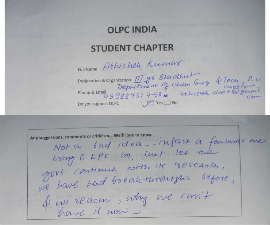 Membership form of OLPC India Student Chapter
