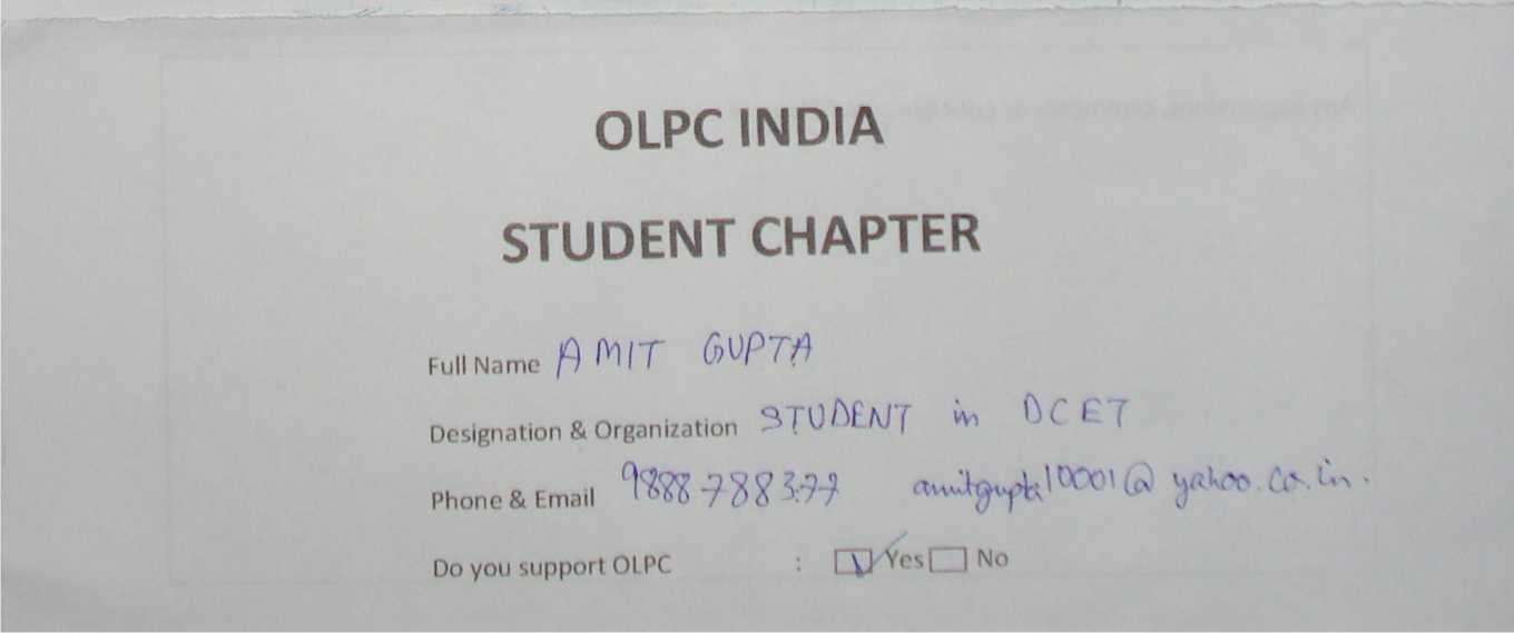 Membership form of OLPC India Student Chapter