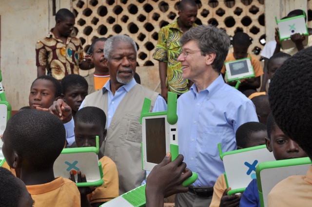 Kofi Annan and Jeff Sachs at a Millennium Village in Bonsaaso, Ghana. Children in the village are taking pictures with their XOs and showing them off.