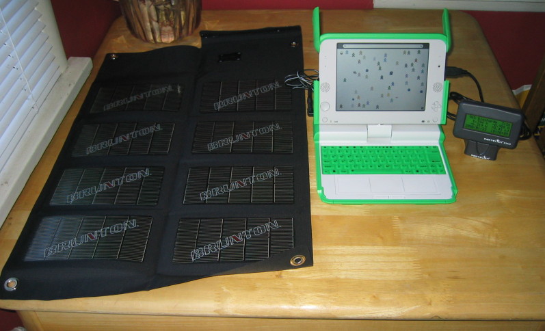 CO149's XO laptop, with Brunton Solaris 12 solar panel and Pertelian X2040 external LCD display.