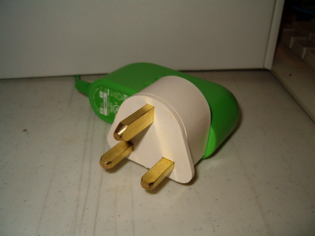 OLPC XO-1 AC Power Adapter with a 3rd-party adapter. This configuration is appropriate for great Britain.