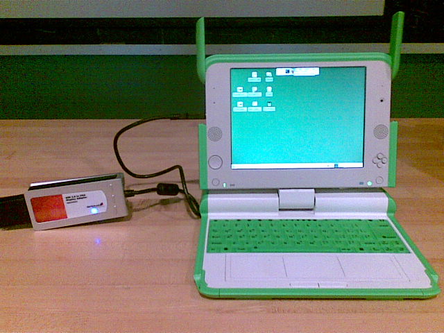 OLPC running Ubuntu and XFCE with attached USB to VGA adapter