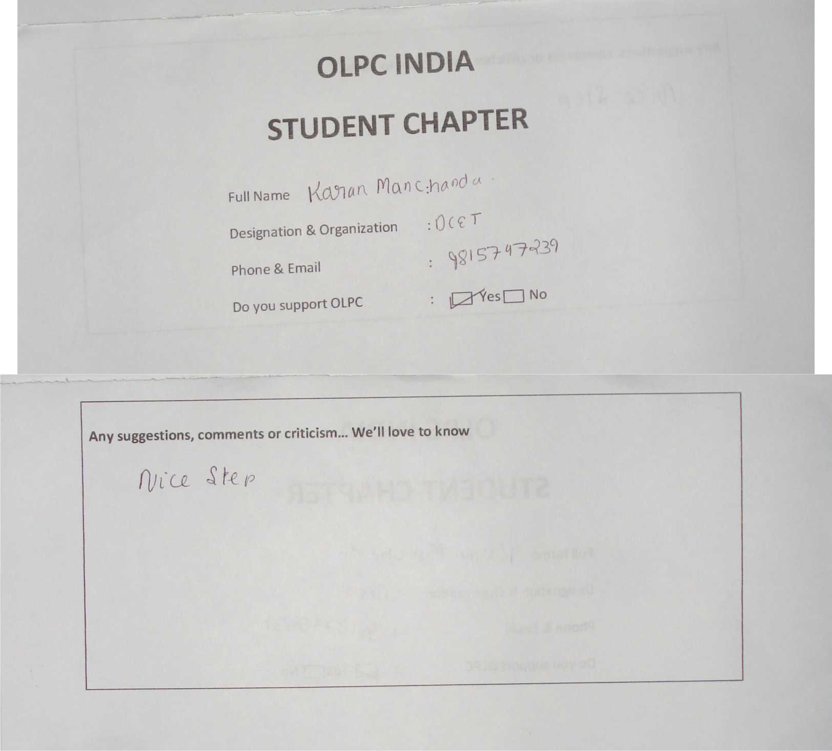 Membership form of OLPC India Student Chapter