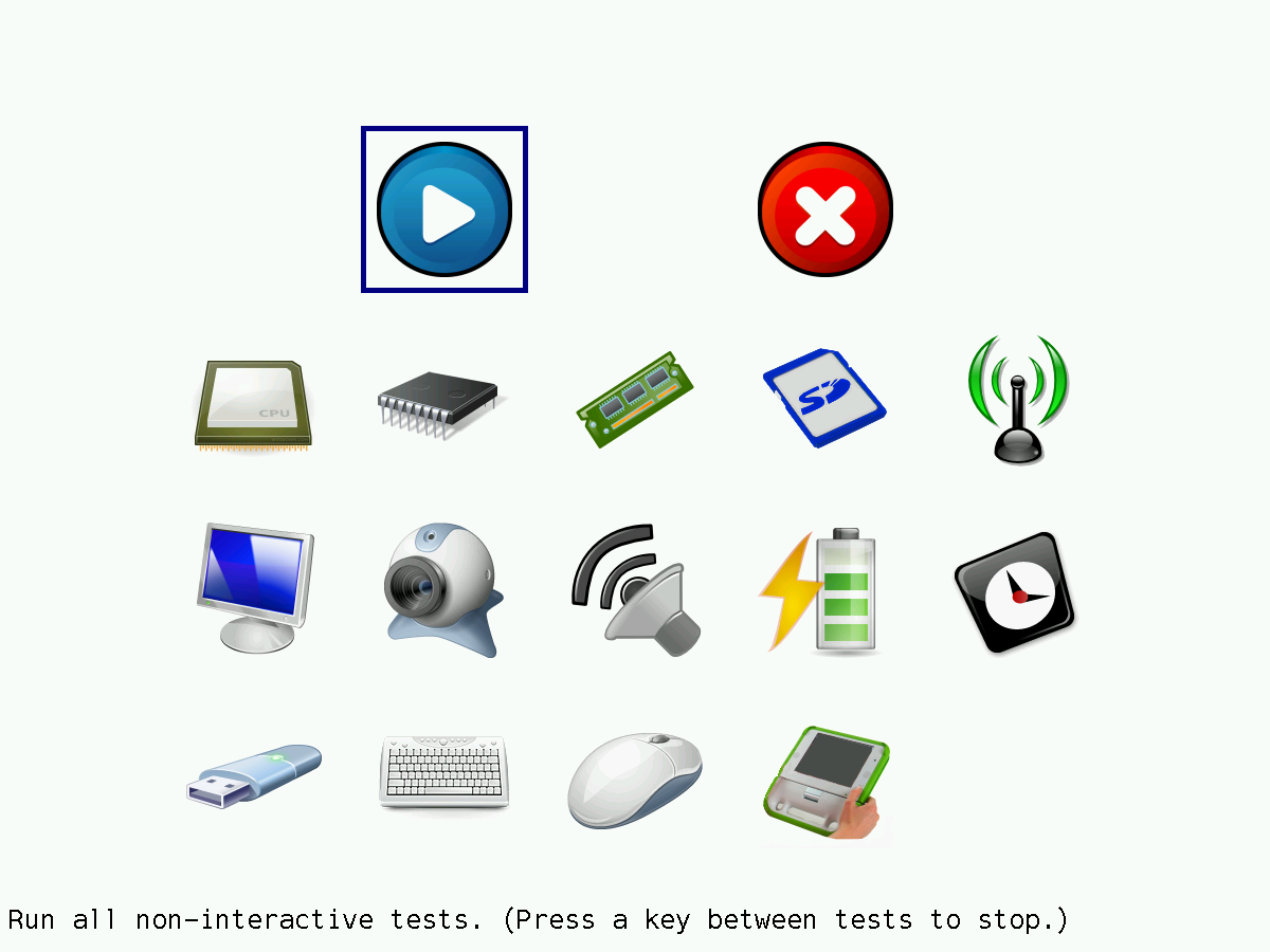 | current | 04:28, 8 January 2014 | Error creating thumbnail: Unable to save thumbnail to destination | 1,200 × 900 (120 KB) | Imported>Quozl | XO-1 Q2F19 diagnostics test menu, with the play all button highlighted. |